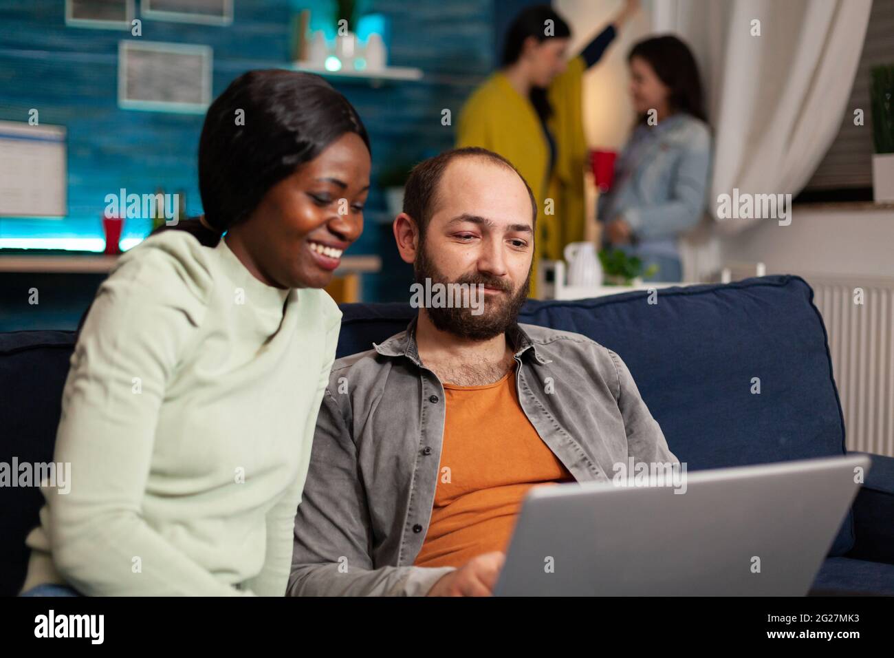 Husband Bakes His Favorite Cherry CakeMiss Mustard SeedMulti-ethnic friends hanging out together sitting on sofa in living room watching entertainment video on phone during evening party